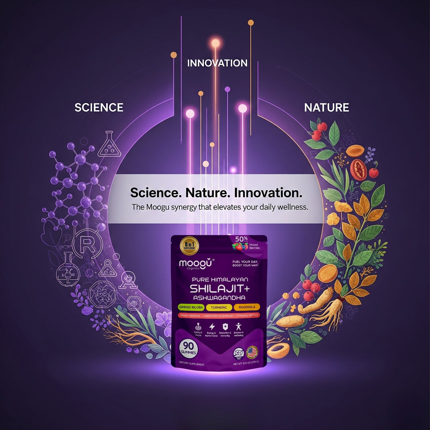 At Moogu Organics, innovation is born from the perfect union of science, nature, and modern wellness. This synergy creates powerful blends that elevate your daily routine.