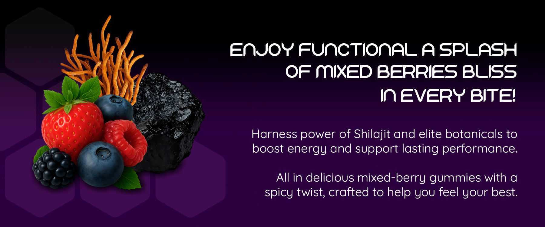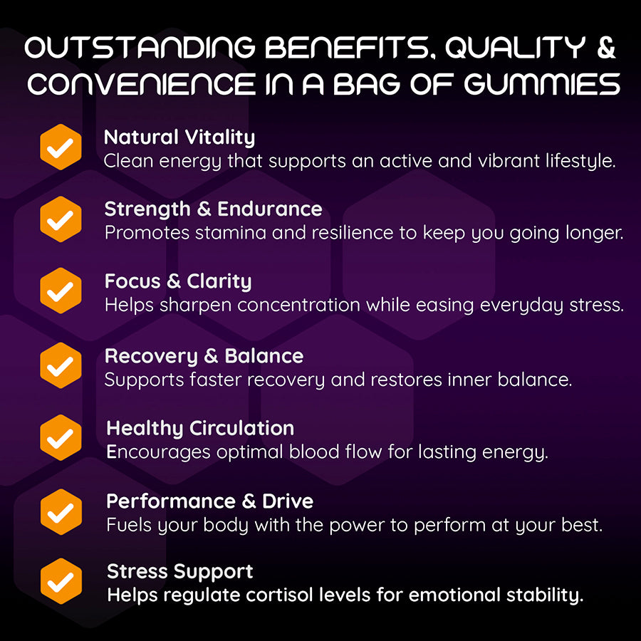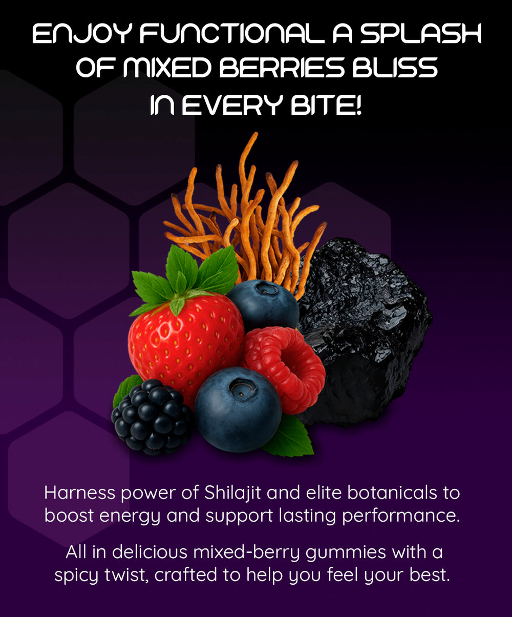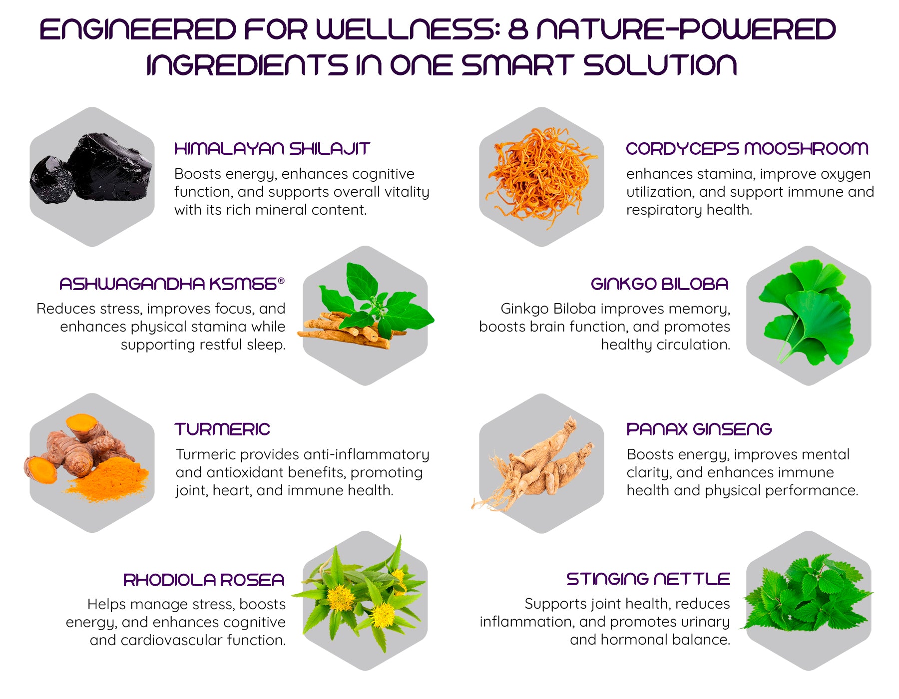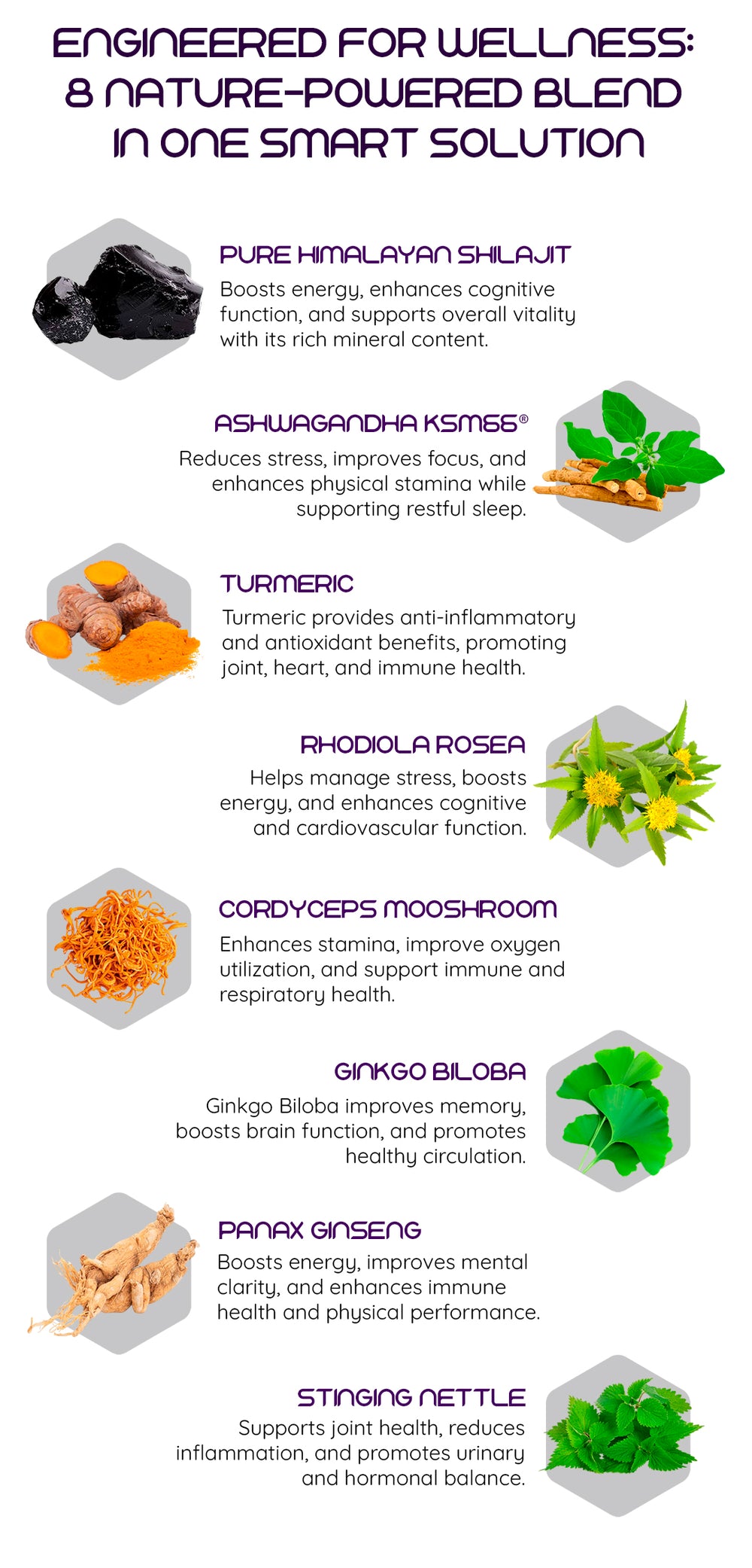 Comprehensive: An 8-in-1 vitality blend centered on Himalayan Shilajit (30:1) with fulvic minerals, plus Ashwagandha, Rhodiola, Panax ginseng, Cordyceps, Ginkgo biloba, Stinging nettle, and Turmeric—a smart daily stack in one tasty gummy.