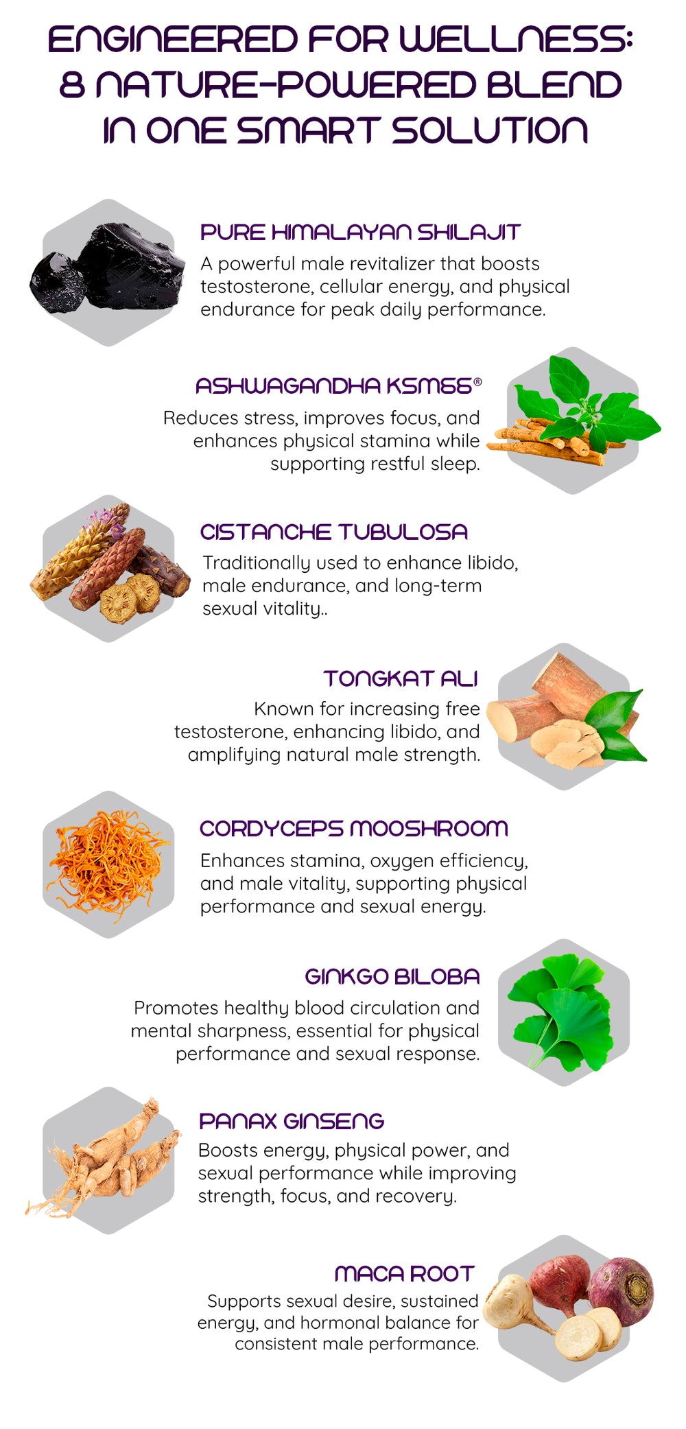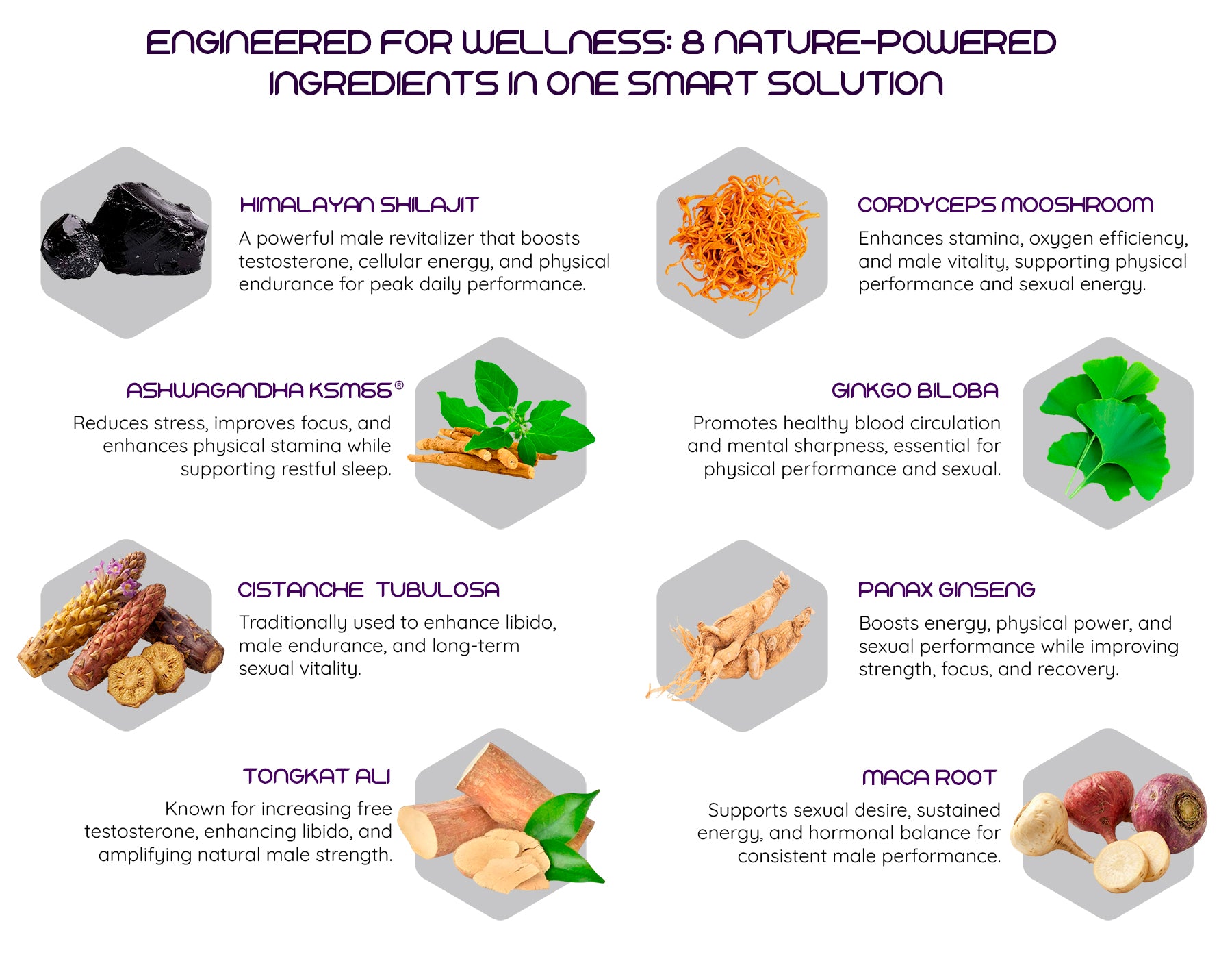 Evidence-based actives: Our re-engineered 8-in-1 formula features a 30:1 Shilajit fulvic-mineral complex and elite adaptogens like Tongkat Ali and Cistanche, specifically combined to optimize masculine drive, stamina, and focus.