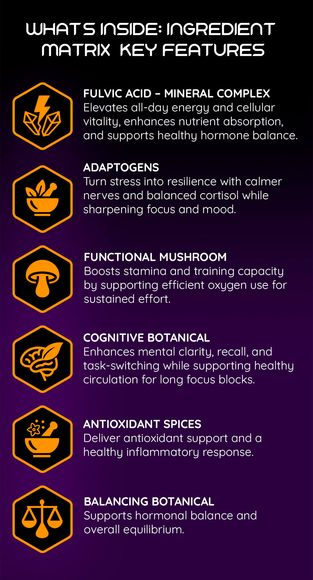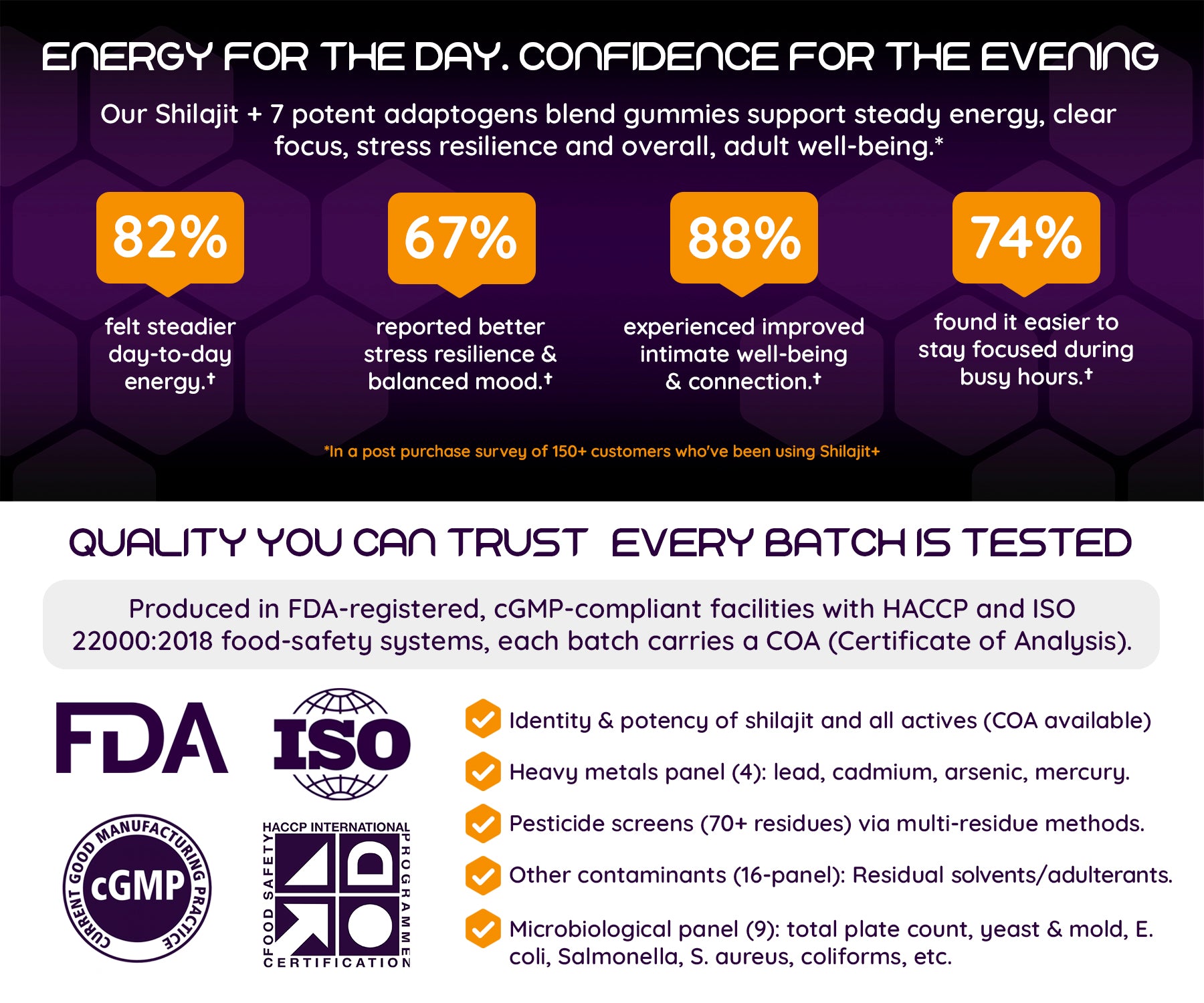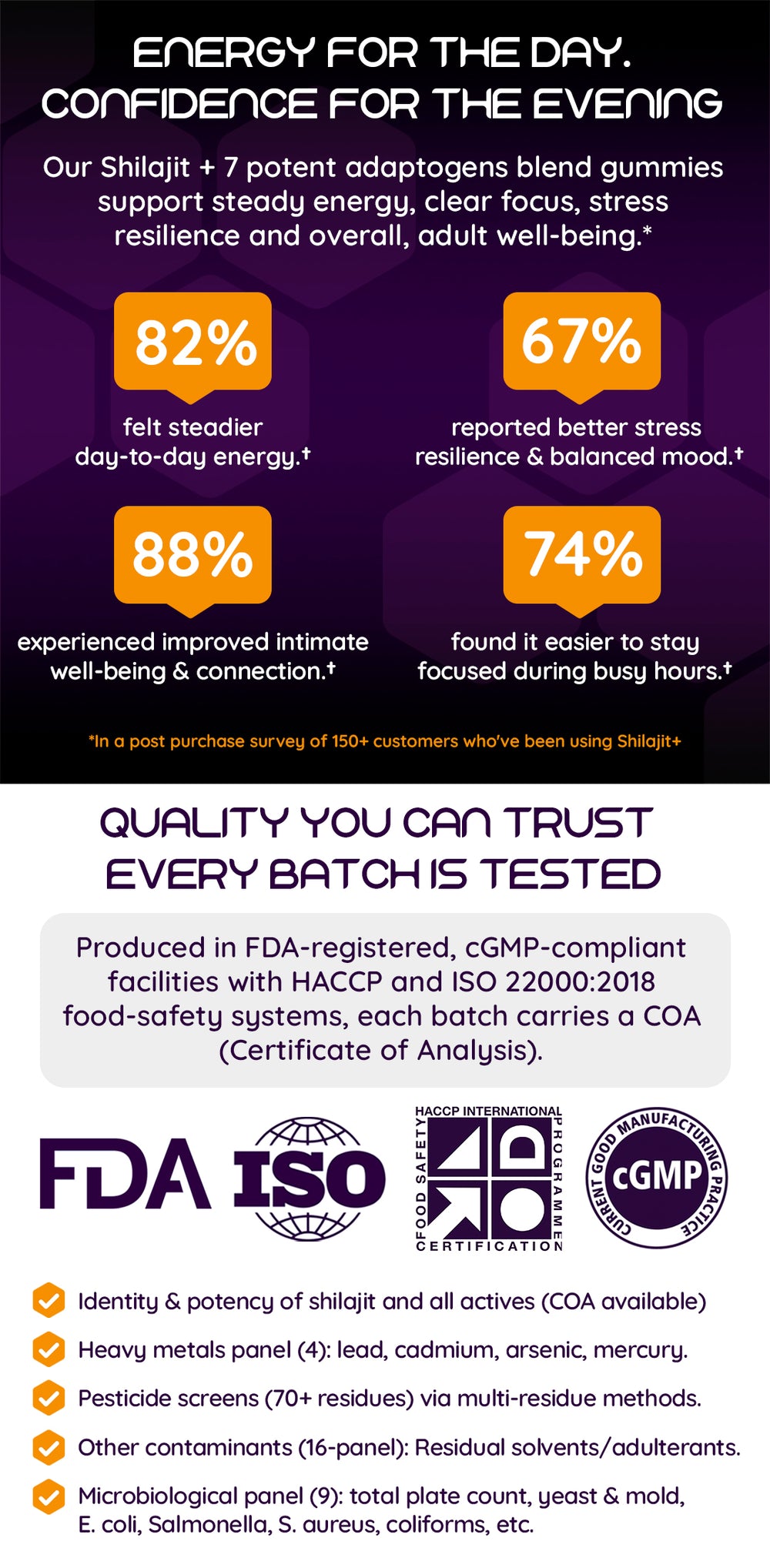 Evidence-based actives: Shilajit’s fulvic-mineral complex and classic adaptogens are widely studied for energy, stress, and focus support.*